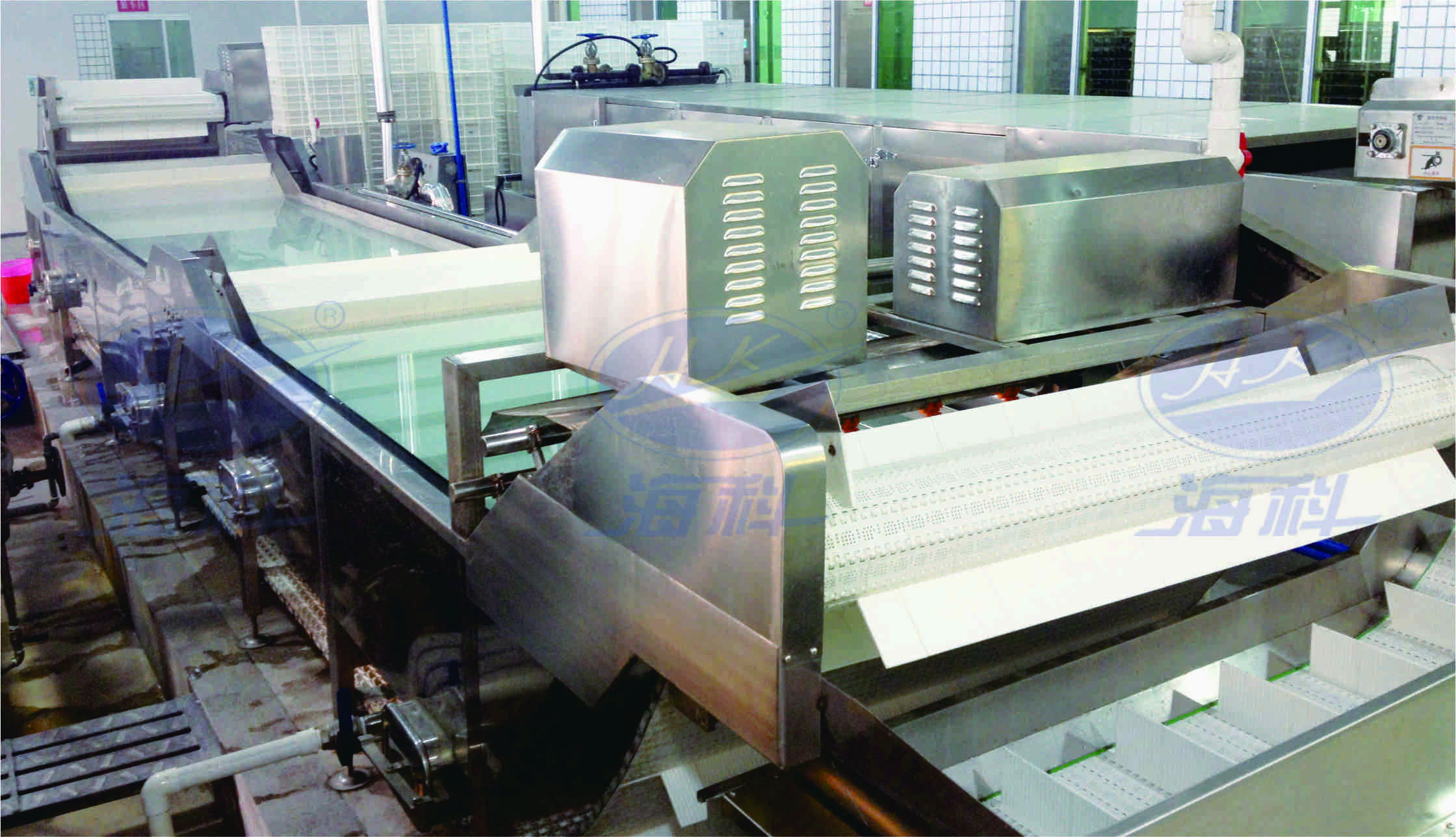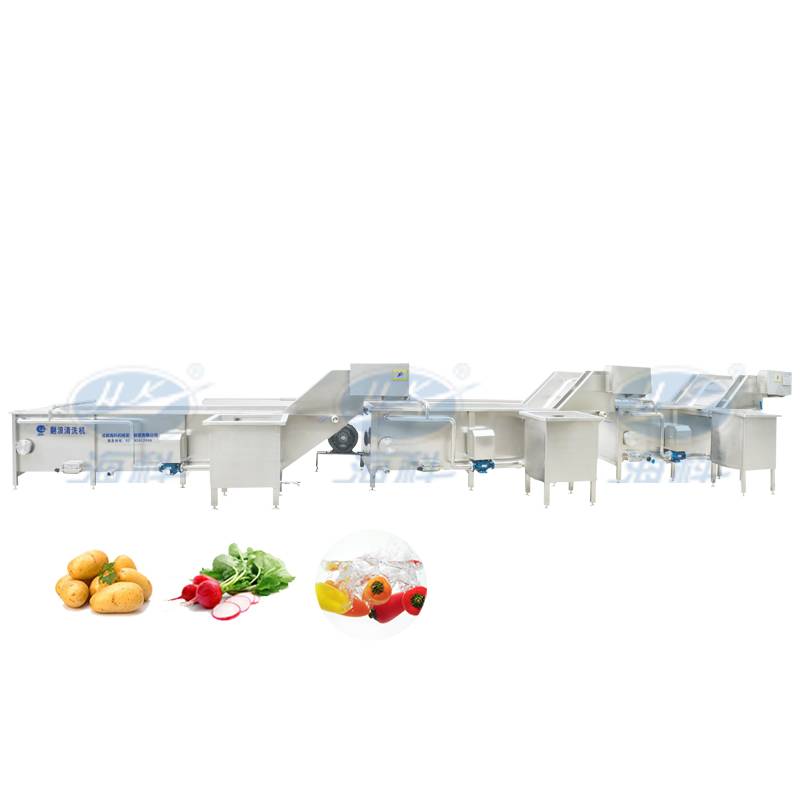 本設備適用青菜、雪菜、蒿菜等葉類鹽漬蔬菜的清洗。原料通過鼓泡、沖浪、高壓噴淋。經過多級清洗,重質雜物沉入箱底,輕質雜物過濾后提升排放,使原料得到徹底的清洗??舍槍Σ煌奈锪虾颓逑匆蠖嗉壗M合配套。本設備采用進口優質全不銹鋼制造,自動化程序高,操作方便,生產能力