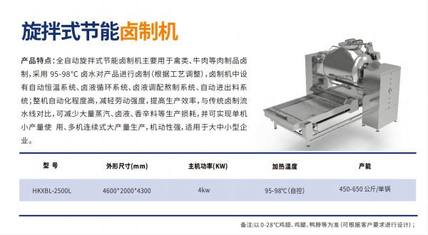 全?動旋拌式節能?制機主要?于禽類、??等?制品?制,采? 95-98 °C ??對產品進??制(根據?藝調整),?制機中設有?動恒溫系統、?液循環系統、?液調配熬制系統、?動進出料系統;整機?動化程度?,減輕勞動強度,提??產效率,與傳統?制流?線對?,可減少?量蒸汽、?液、??料等?產損耗,并可實現單機?產量使 ?、多機連續式?產量?產,機動性強,適?于?中?型企業。