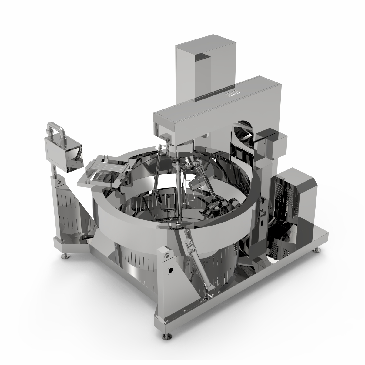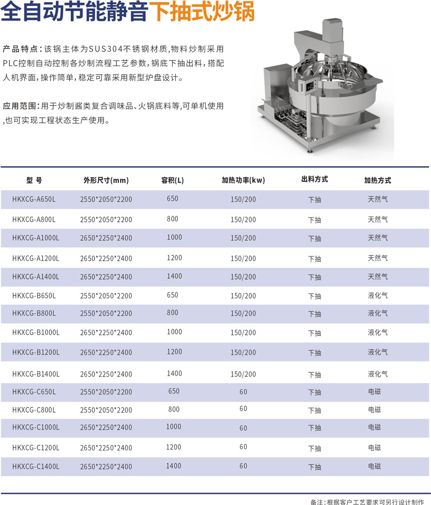 該鍋主體為SUS304不銹鋼材質(zhì),物料炒制采?PLC?動(dòng)控制各炒制流程?藝參數(shù),液壓翻轉(zhuǎn)出料,搭配?機(jī)界?, 操作簡單,穩(wěn)定可靠,采?新型爐盤設(shè)計(jì)。